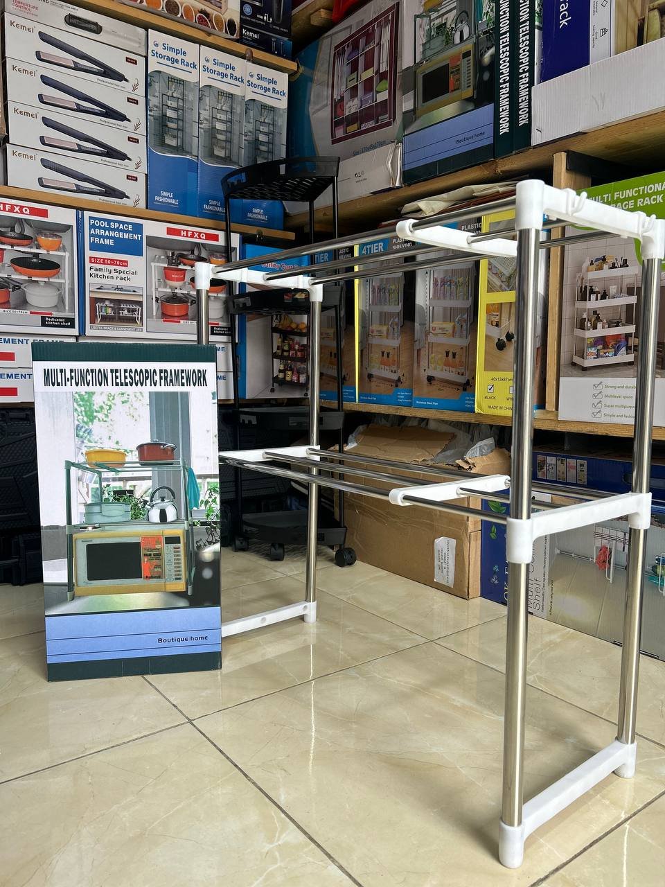 استغلال ذكي للمساحة: صُمم ليتم وضعه فوق الميكروويف، مما يضاعف مساحة التخزين على “الرخامة” ويحولها إلى رفوف إضافية مرتبة.