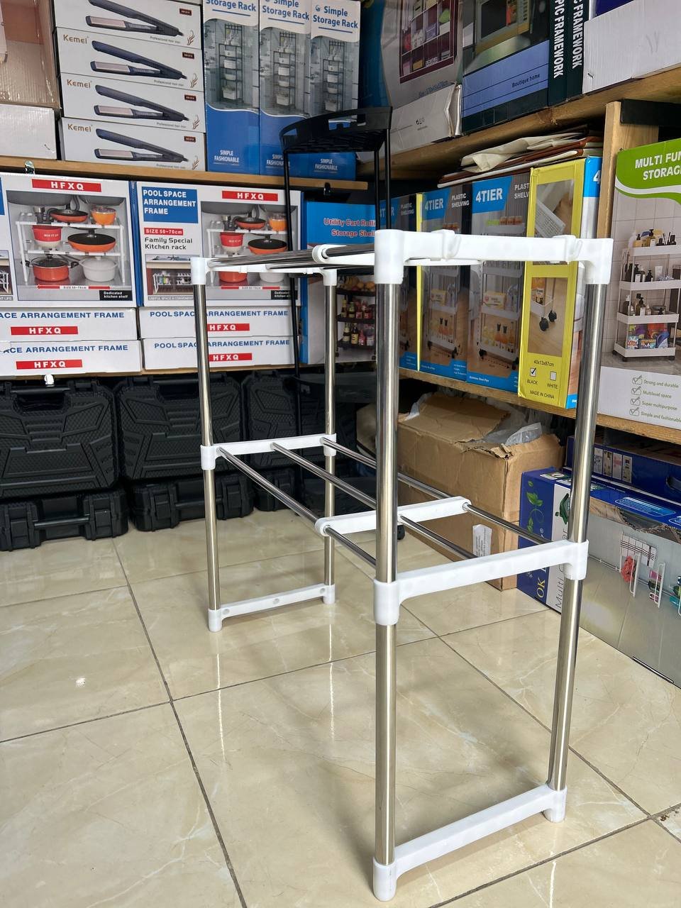 متانة عالية: هيكل مصنوع من الفولاذ المقاوم للصدأ (Stainless Steel) مع قطع تثبيت قوية تضمن الثبات وتحمل الأوزان الثقيلة كالأطباق، الغلايات، وأدوات الطبخ.