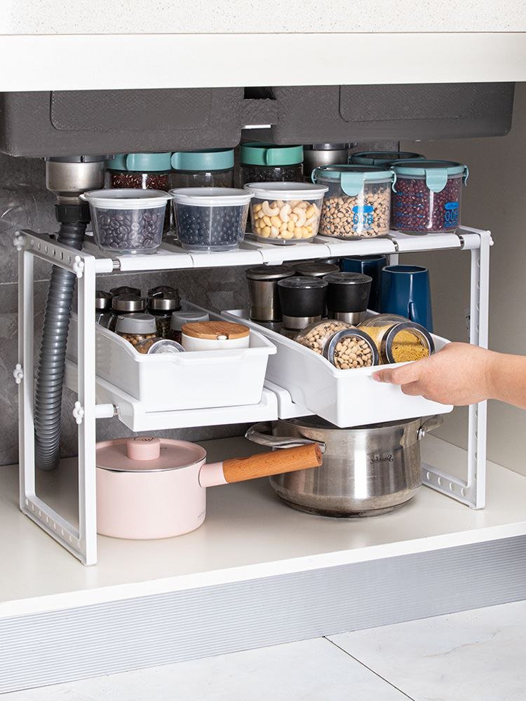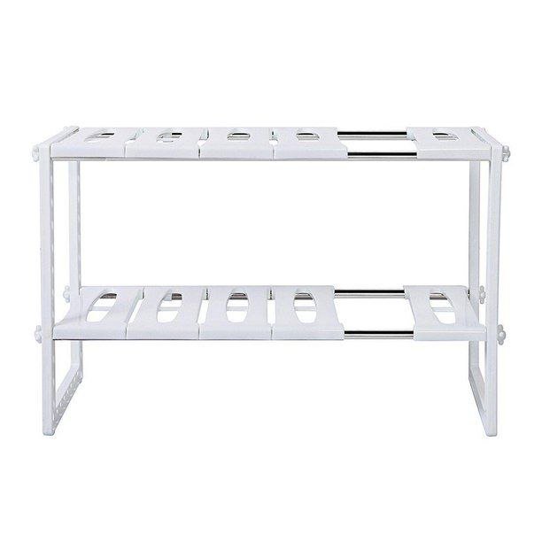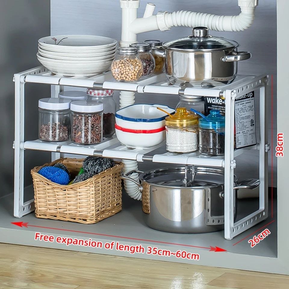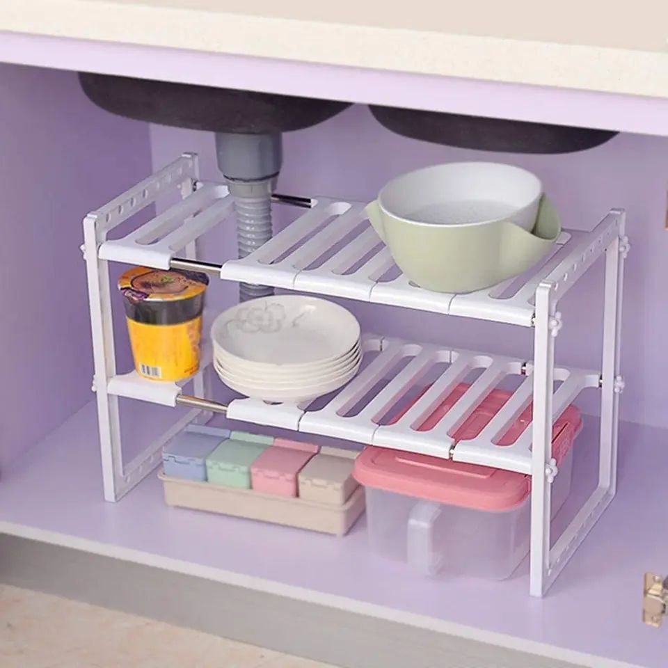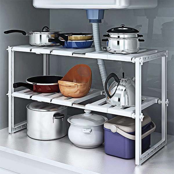 طابقين للتنظيم: يوفر لك مستويين لتخزين الطناجر، المقالي، الأجهزة الكهربائية الصغيرة، أو حتى مواد التنظيف بشكل مرتب.