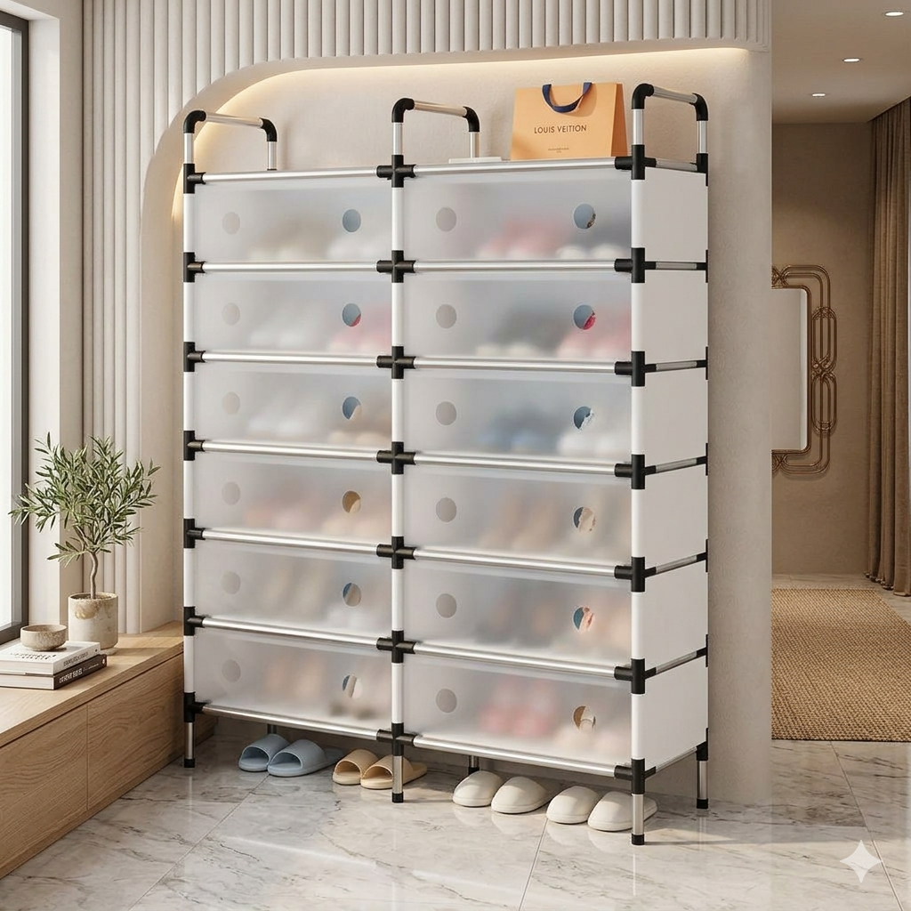 واجهة شبه شفافة: أدراج مغطاة بألواح بلاستيكية مرنة تسمح برؤية محتوى الحذاء مع الحفاظ على مظهر مرتب وحماية من الغبار.