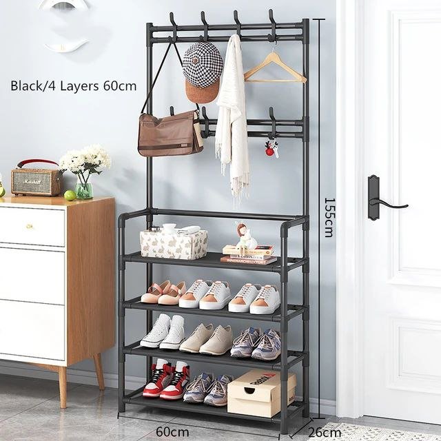 سعة تخزين كبيرة: يحتوي على 4 طبقات واسعة لتنظيم الأحذية، بالإضافة إلى طابق علوي يضم 8 خطافات مزدوجة لتعليق الحقائب، القبعات، والمظلات.